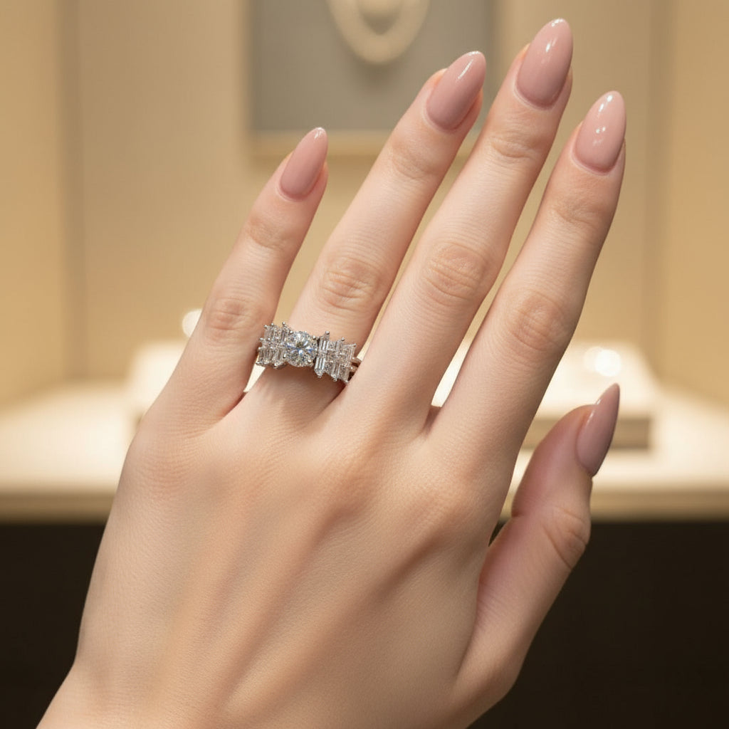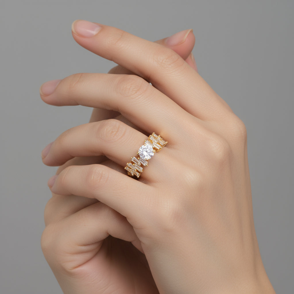 The Aurora Baguette Solitaire Ring is the perfect blend of modern elegance and timeless design. Featuring a brilliant round-cut crystal centerpiece surrounded by precisely cut baguette stones, this ring delivers unmatched brilliance from every angle.