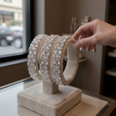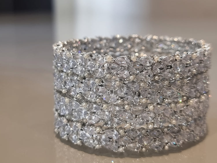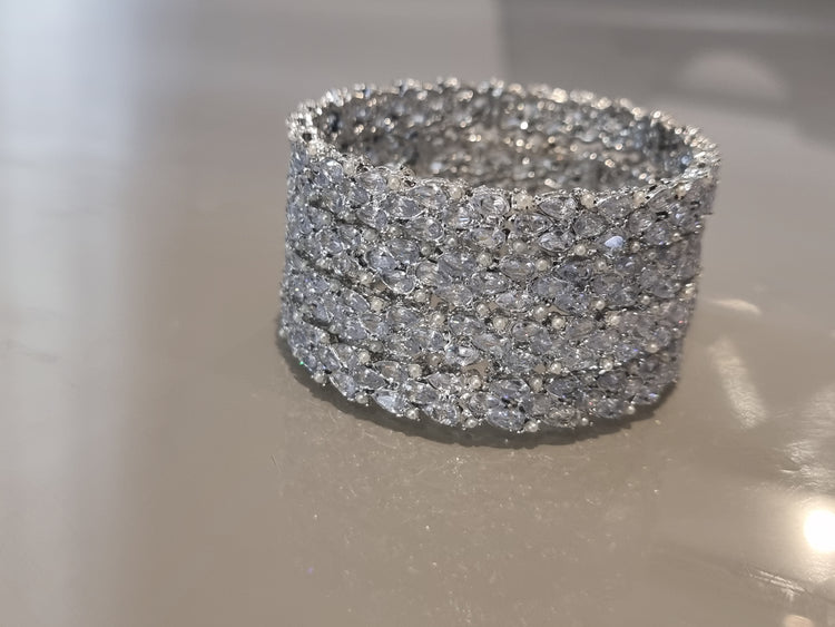 Step into elegance with this wide silver crystal bangle, designed with layers of sparkling stones that catch every glimmer of light. Perfect for weddings, evening wear, or adding a bold touch to your jewellery collection.