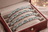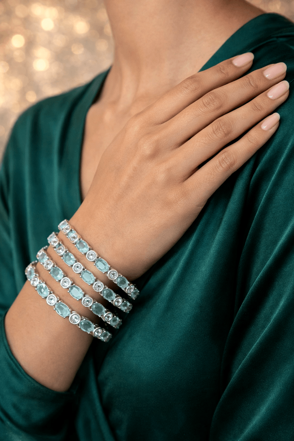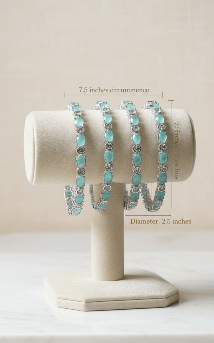 Add a touch of elegance to your jewellery collection with this stunning silver-tone mint green crystal bangles set. Designed with beautiful oval mint green stones and sparkling clear crystal detailing, these bangles offer a perfect blend of grace and luxury.