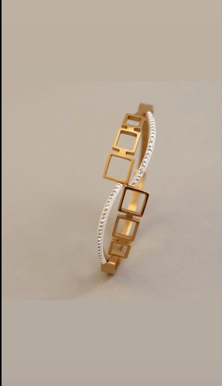Add a touch of modern elegance to your jewellery collection with this golden and white geometric bangle. Designed with a sleek square-link pattern and dual-tone finish, this bracelet beautifully blends contemporary style and timeless charm. The polished gold tone and sparkling white accents make it perfect for both everyday wear and special occasions.