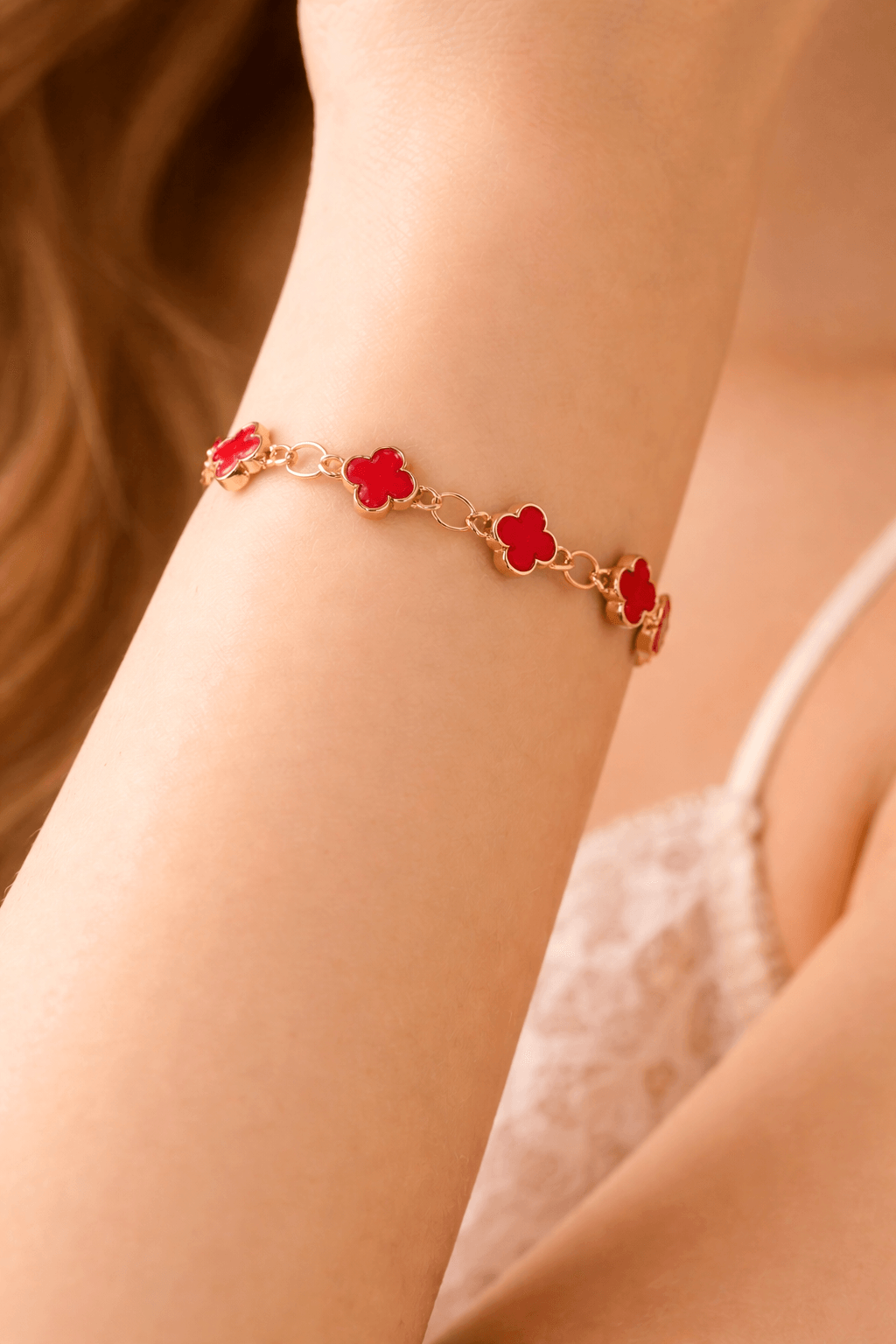 This elegant red clover charm bracelet features delicately crafted clover motifs finished with rich red enamel and set on a fine gold-plated chain. The design offers a perfect balance of colour and sophistication, making it a standout yet wearable piece.