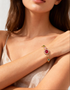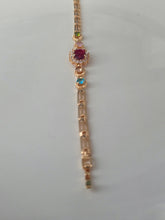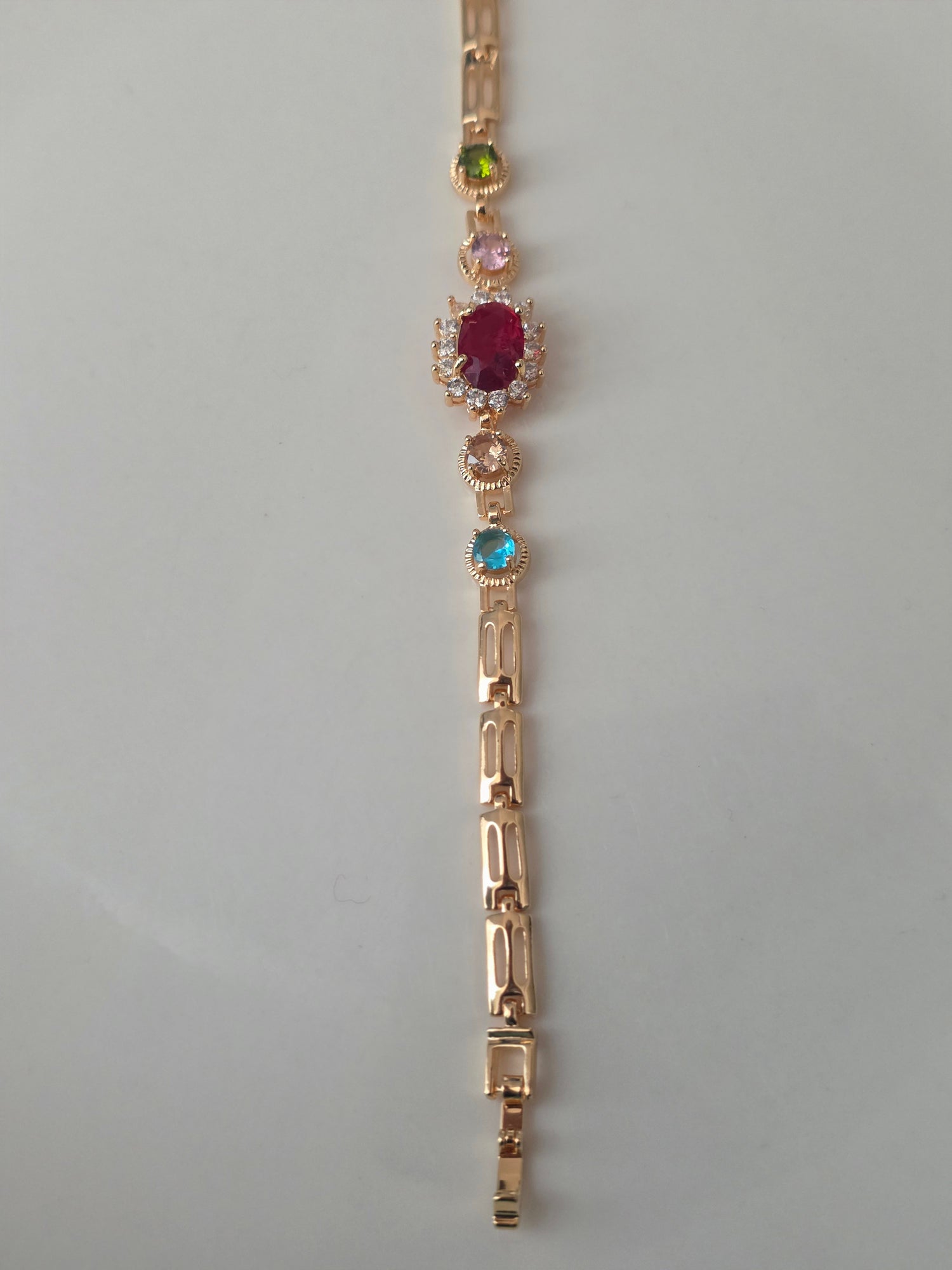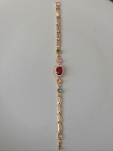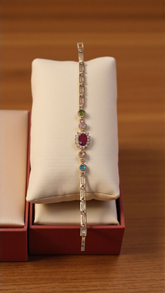 The Regal Gemstone Elegance Bracelet is a timeless piece crafted to add sophistication and vibrant charm to any outfit. Featuring a striking ruby-red centerpiece framed by sparkling cubic zirconia and accented with multicolored stones (green, pink, and aqua), this bracelet delivers a perfect balance of elegance and playfulness.