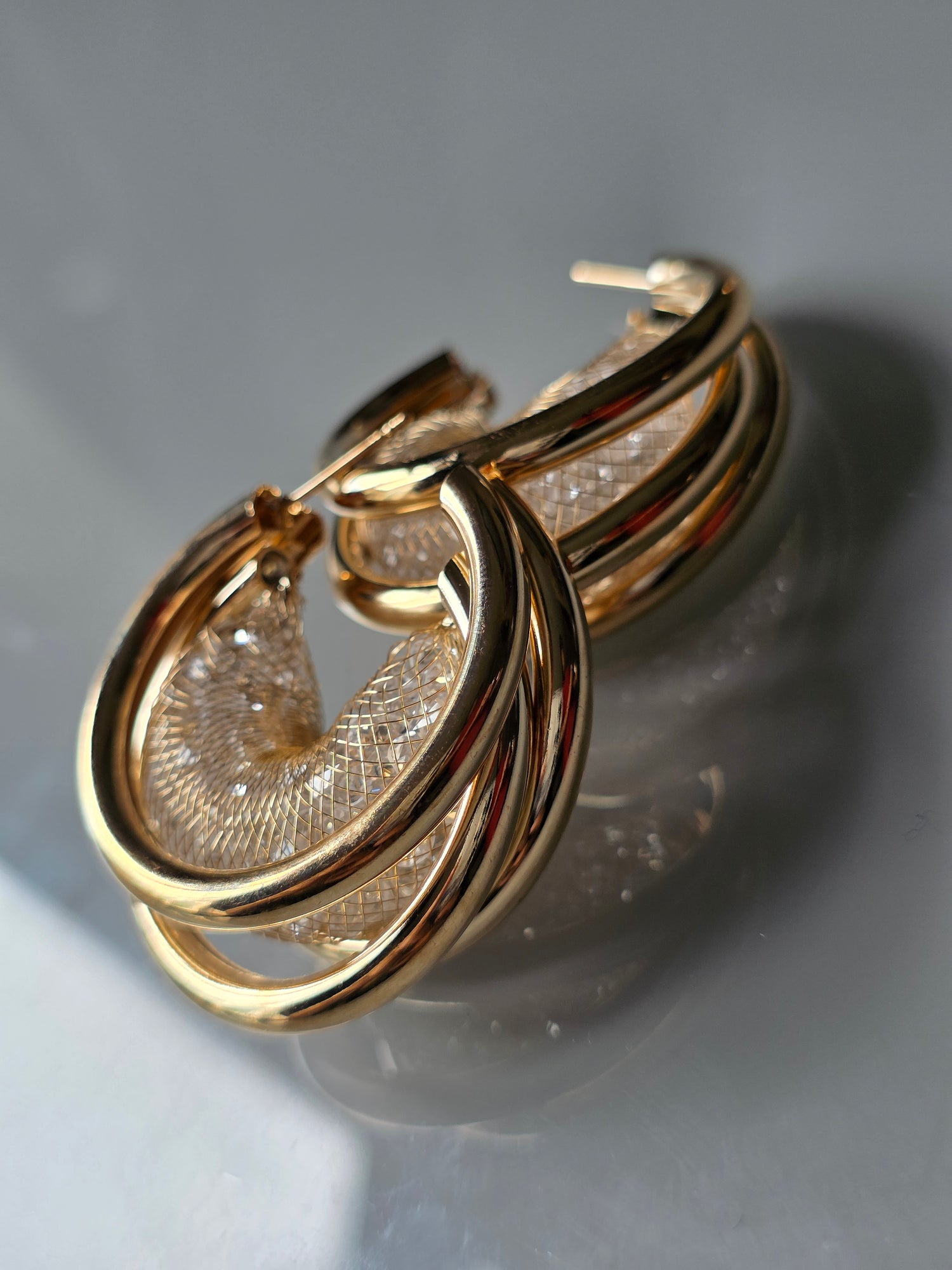 Crafted with high-quality gold plating, these hoops feature a unique twisted mesh detail, making them a timeless statement piece for any occasion.