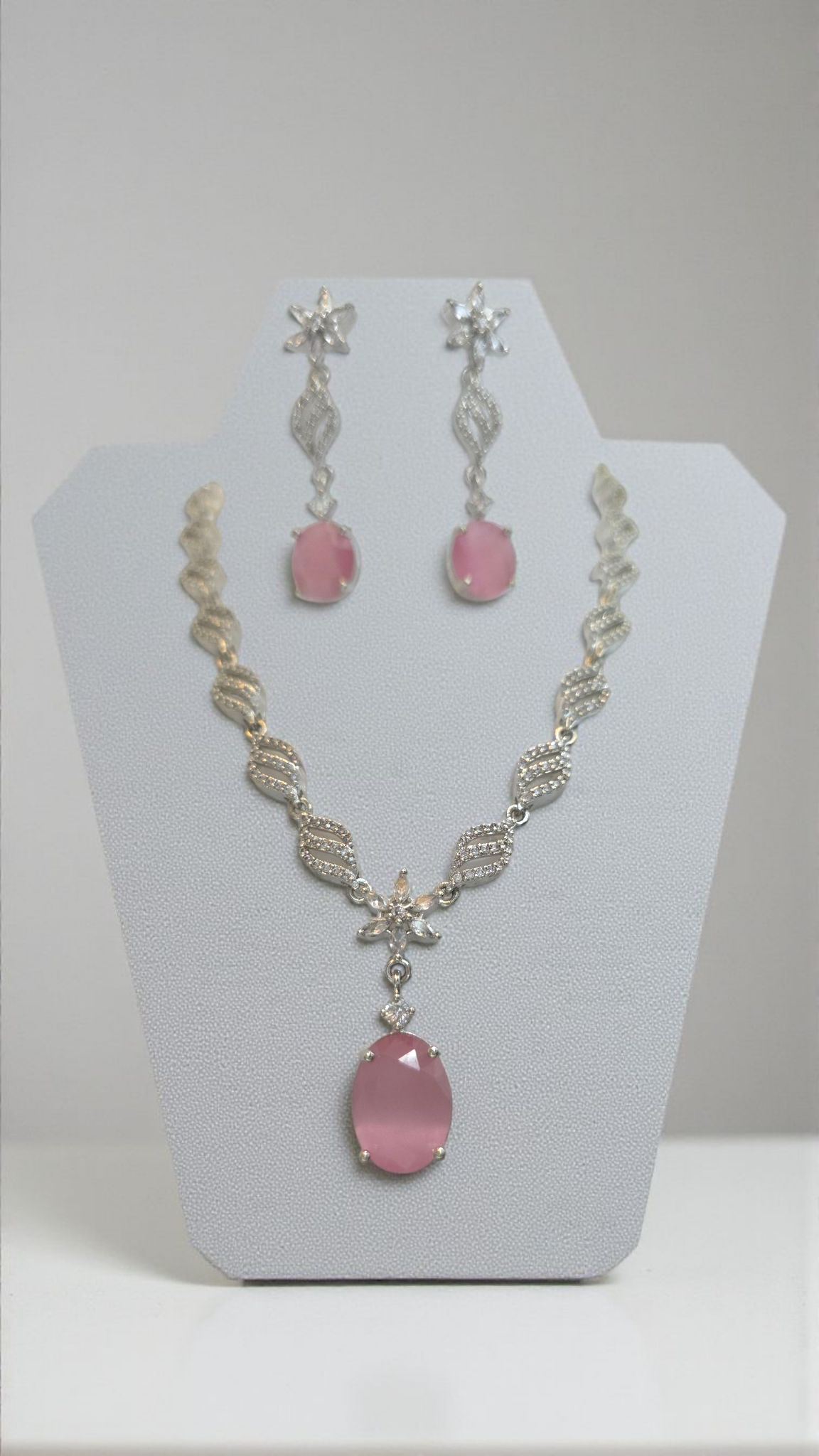Elegant Oval Crystal Necklace Set with Earrings & Tikka – Pink & White Variants
