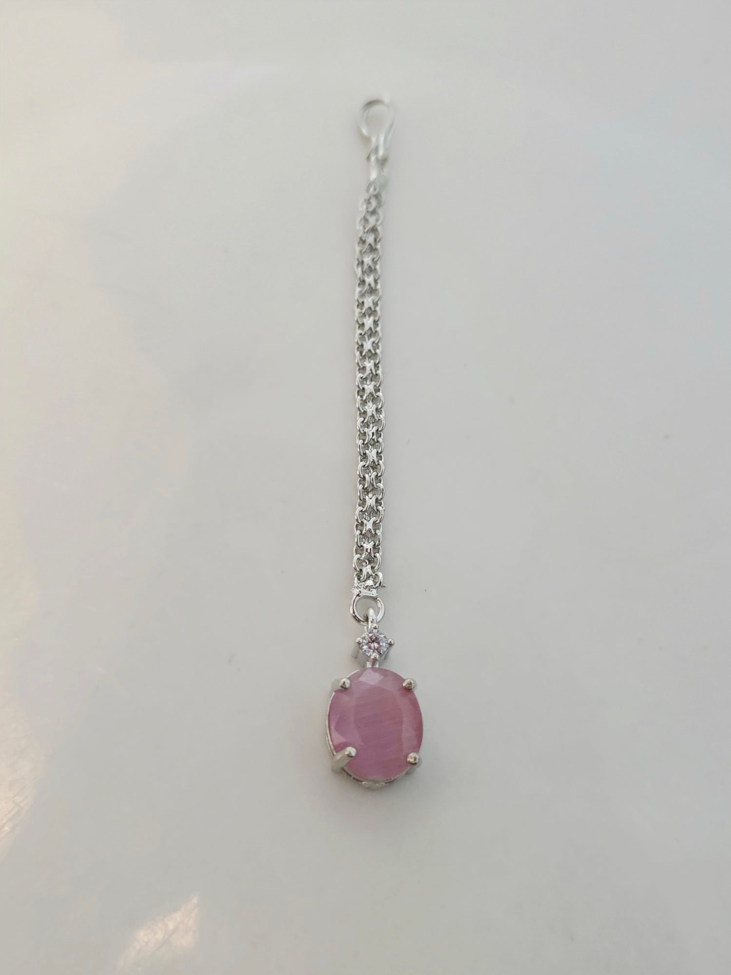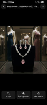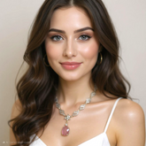The set includes a statement necklace, drop earrings, and a matching forehead tikka, giving you a complete and coordinated look. Available in romantic pink and classic white/clear, it’s a versatile addition to your jewellery collection.