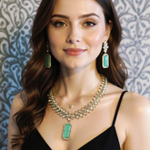 Turn heads with this Emerald Glow Necklace & Earring Set, crafted with a silver-plated finish and sparkling cubic zirconia accents. The bold rectangular emerald-green stones are framed by shimmering crystals, creating a perfect balance of elegance and statement style