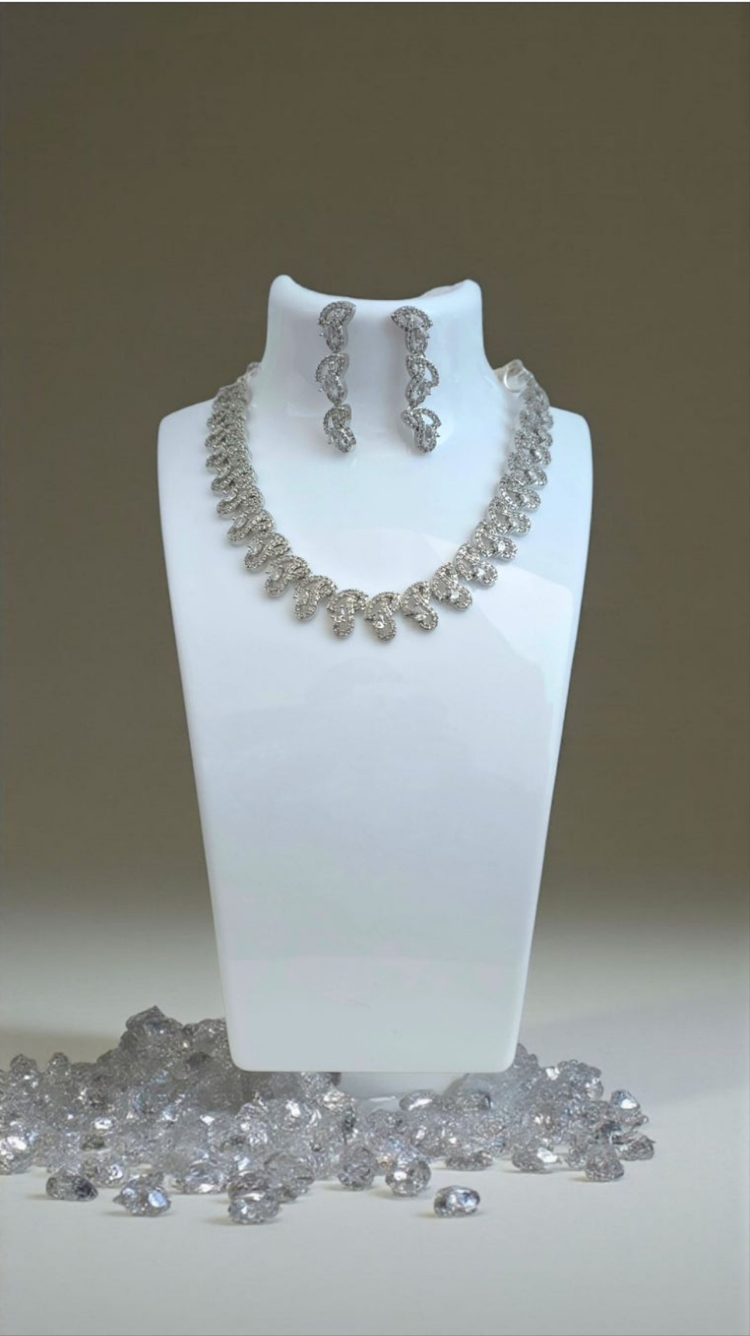 Jewellery Set, featuring an intricate leafy vine design encrusted with shimmering stones. This 3-piece set includes a bracelet, drop earrings, and a maang tikka, making it the perfect choice for weddings, parties, and festive occasions.