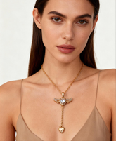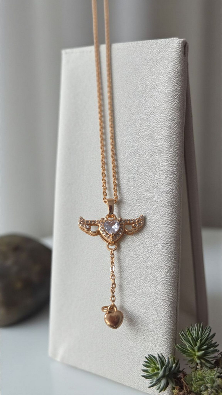 Make an unforgettable statement with the Elysian Wings Heart Pendant Necklace – Gold Edition, a perfect blend of elegance, symbolism, and modern charm. Designed with a stunning heart-cut crystal at the center, surrounded by pave-set cubic zirconia wings, and finished with a delicate dangling heart charm, this necklace captures the essence of love and freedom.
