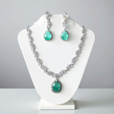 Elevate your look with our Emerald Green Teardrop Necklace & Earrings Set, a timeless design that blends elegance with luxury. The set features a stunning green teardrop pendant framed with sparkling crystals, paired with matching drop earrings for a coordinated and eye-catching finish