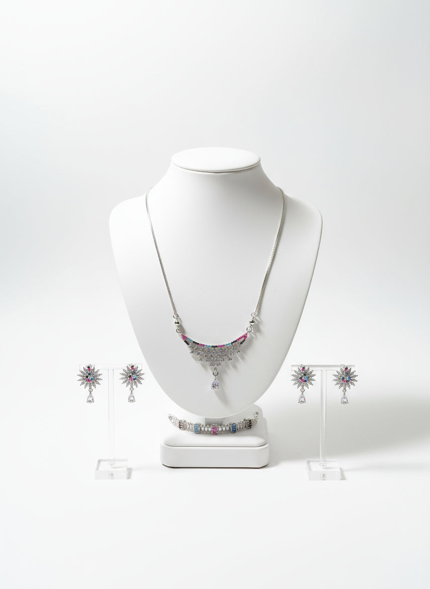 Elevate your style with this stunning Peacock Crystal Jewellery Set, featuring a statement necklace, matching earrings, and bracelet. Designed with shimmering crystals and intricate peacock-inspired detailing, this set is available in three elegant colours – Multicolour, Black, and Pink.