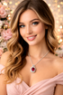 Woman wearing a necklace with a pink pendant against a blurred floral and light background