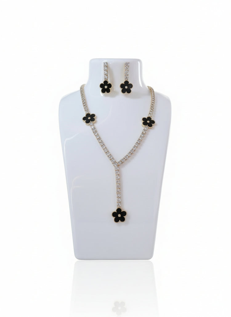 Elevate your look with this Black Clover Gold-Plated Necklace and Earring Set, designed for women who love elegant, modern jewellery with a luxury touch. This stunning set features a sparkling crystal V-shaped chain paired with beautifully crafted black enamel clover charms, symbolising luck, beauty, and timeless style.