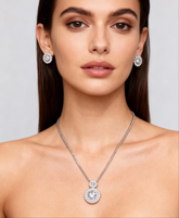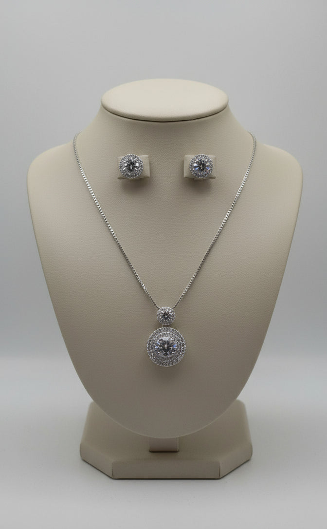 This stunning set features a brilliant round-cut crystal pendant paired with matching stud earrings, delicately framed with micro-pavé stones for an irresistible shine. Designed for both everyday wear and special occasions, it’s the perfect statement of effortless luxury.