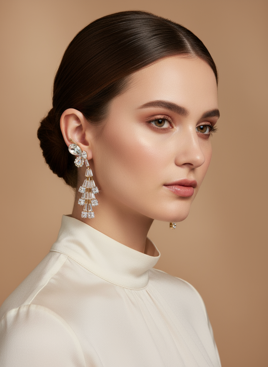Lightweight yet eye-catching, the Celestia earrings are crafted using AAA-grade cubic zirconia and premium gold-plated detailing, making them ideal for weddings, parties, festive celebrations, and evening looks.