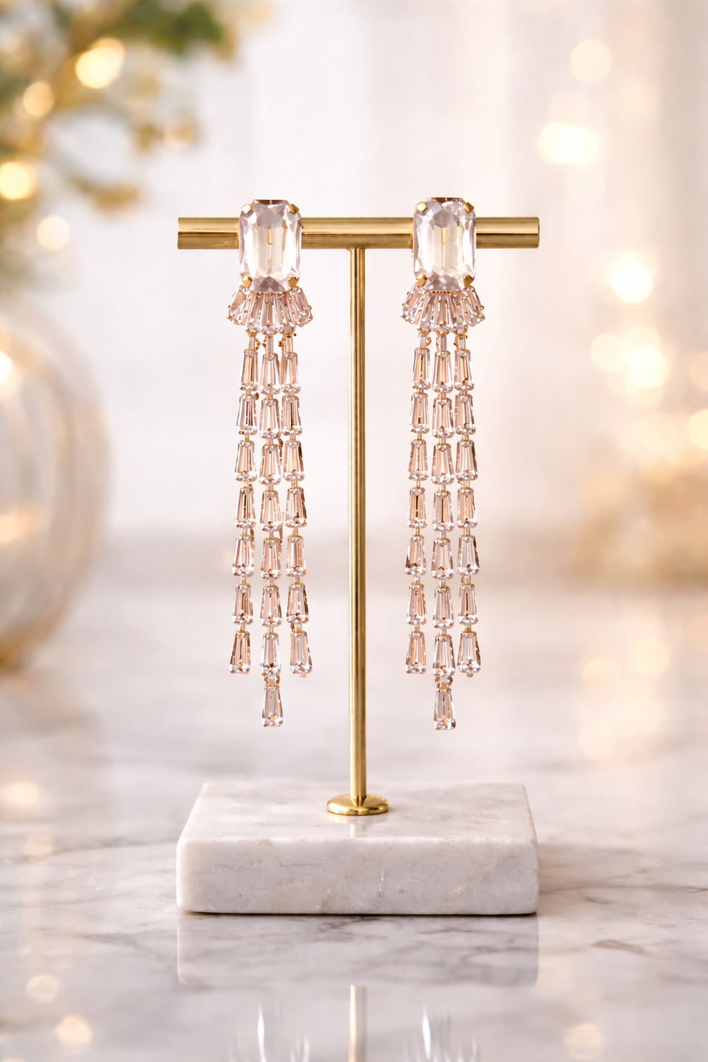 Whether you choose the warm elegance of Champagne Gold or the classic brilliance of Silver Shine, these waterfall crystal tassel earrings are the perfect statement piece to elevate any outfit.