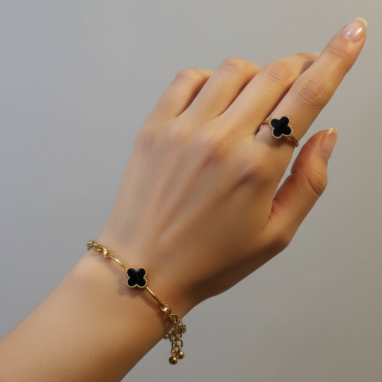 Elevate your everyday style with this Gold Clover Bracelet & Ring Set, available in elegant white or bold black. The iconic clover design, framed in polished gold, symbolizes luck and timeless charm.