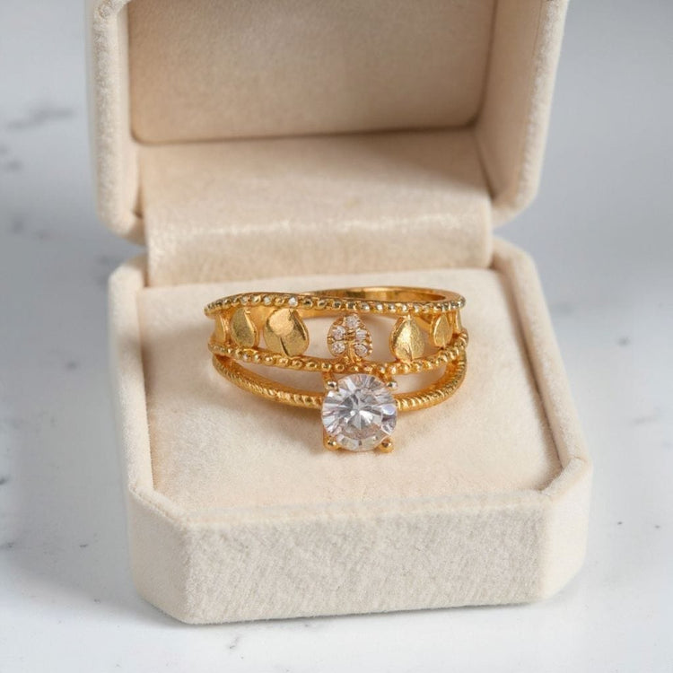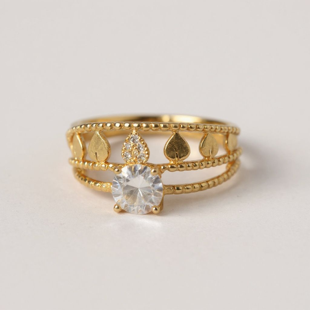 Bring regal elegance to your jewellery collection with this Gold Crown Ring, designed with a royal-inspired band and a brilliant round-cut zircon stone at its centre. The triple-layer crown detail and teardrop motifs give it a luxury statement look while staying lightweight and comfortable for everyday wear.