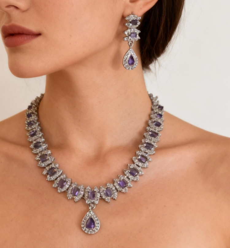 The matching drop earrings add balance and style, making this set a perfect choice for weddings, evening parties, proms, or gifting. Crafted with a silver-plated base, it combines durability with luxury, ensuring you sparkle with confidence.