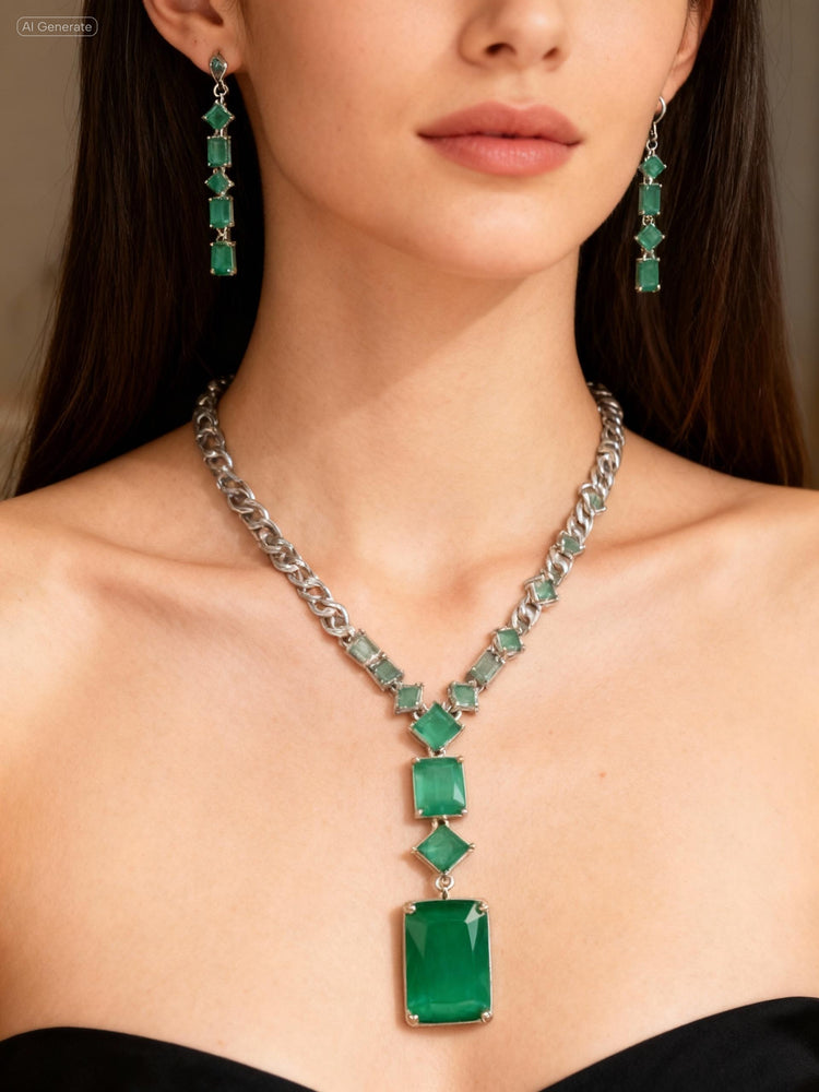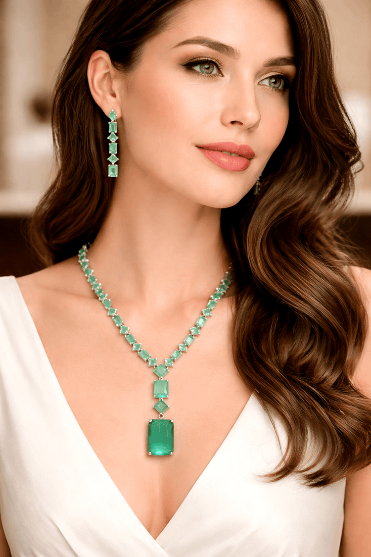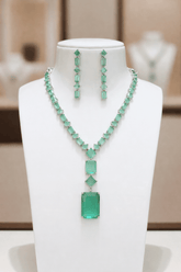 The set includes matching drop earrings that complement the necklace effortlessly, completing a balanced and polished appearance. Available in four stunning colour variants – Baby Pink, Emerald Green, Amethyst Purple, and Crystal Clear, this design offers versatility to pair seamlessly with a wide range of outfits, from festive ensembles to elegant evening wear.