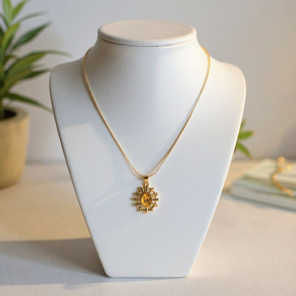 The Radiant Sunburst Pendant Necklace captures timeless elegance with a modern, luxurious touch. Featuring a stunning round-cut gemstone at its center, surrounded by baguette-cut crystals in a radiant sun-inspired design, this necklace is perfect for making a bold yet graceful statement.