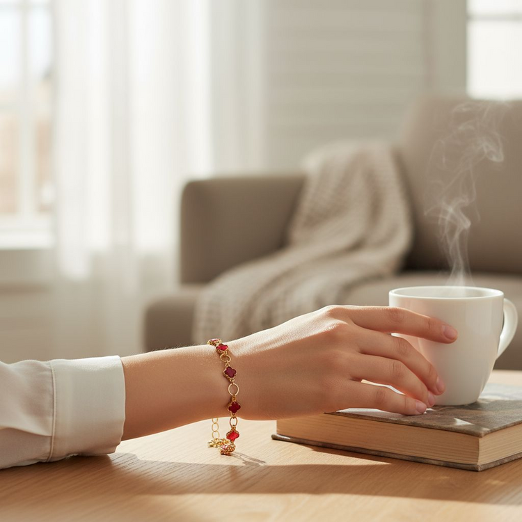 Add a pop of bold elegance to your look with our Red Clover Charm Bracelet. Featuring glossy red enamel clover motifs set on a delicate gold-plated chain, this bracelet brings timeless charm and everyday sophistication. Perfect to wear solo for a minimalist touch or stack with other bracelets for a statement style.