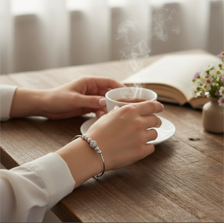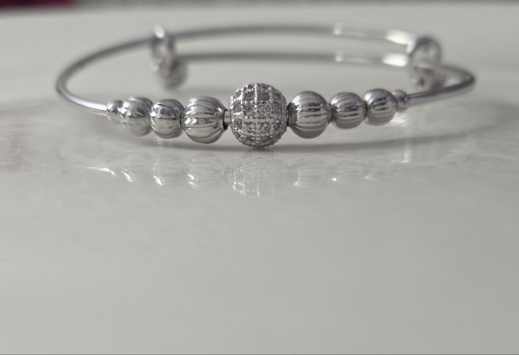 Add a touch of subtle sparkle to your everyday look with this Silver Beaded Adjustable Bangle. Featuring a row of polished metallic beads with a crystal-studded centerpiece, this bracelet strikes the perfect balance between minimalism and elegance.
