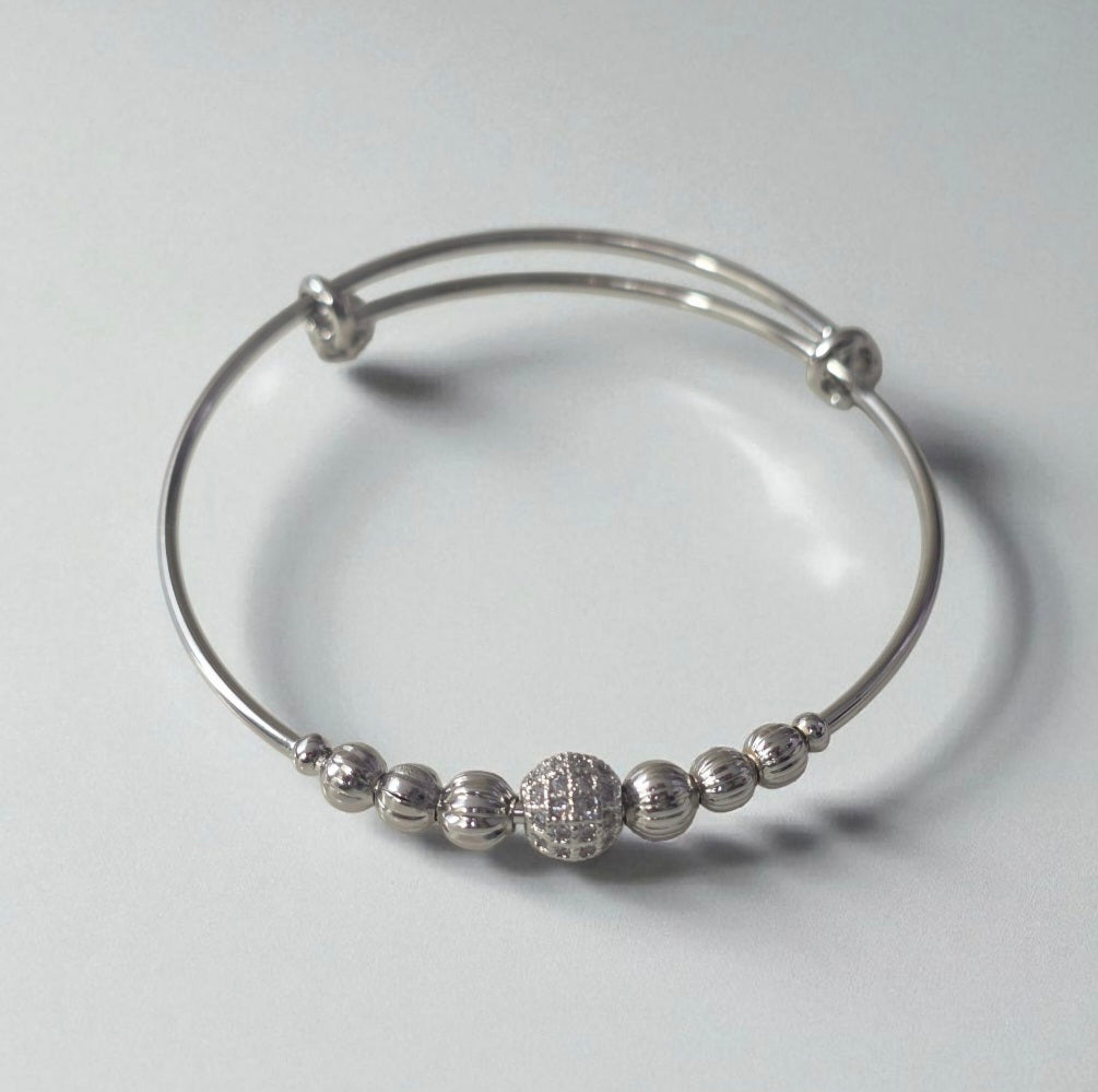 Silver Beaded Adjustable Bangle - Crystal Accent Charm