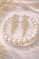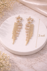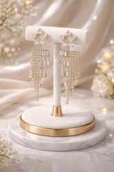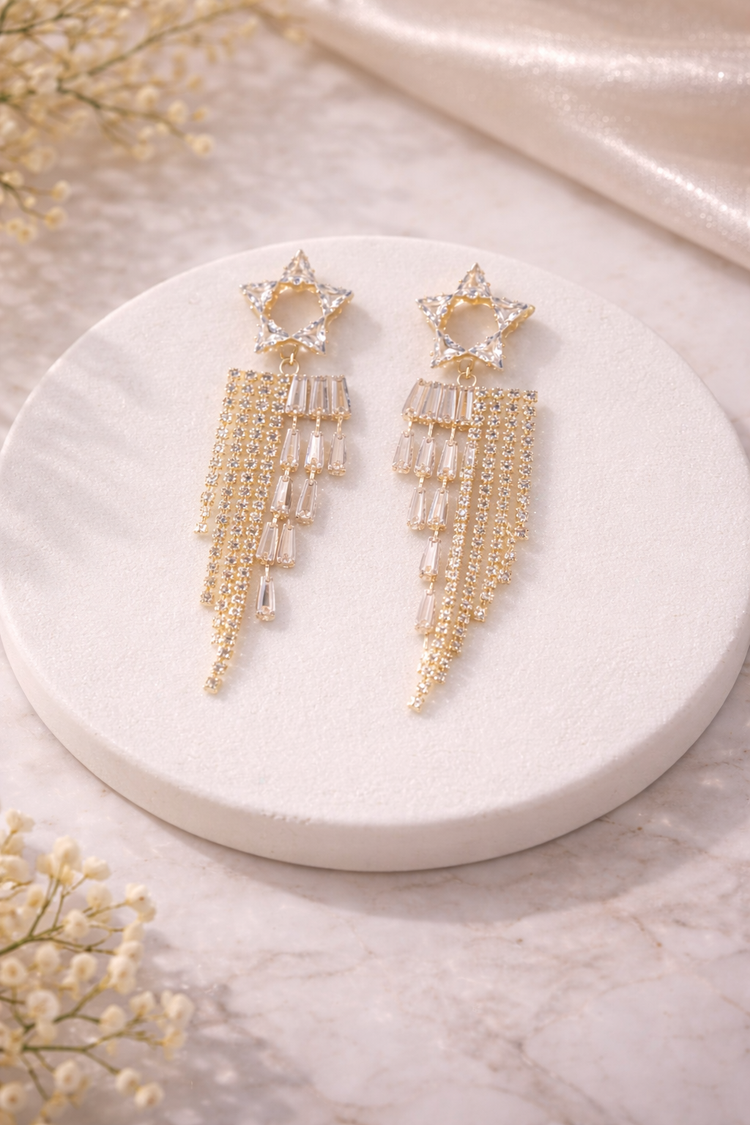 Make an unforgettable style statement with these Starburst Cascade Crystal Statement Earrings, beautifully designed in a striking 3-inch length for maximum elegance and impact. Crafted from premium 18K gold-plated alloy, these earrings feature a radiant starburst-inspired top that flows into multi-layer cascading strands of AAA-grade baguette and round crystals, creating a glamorous waterfall effect.