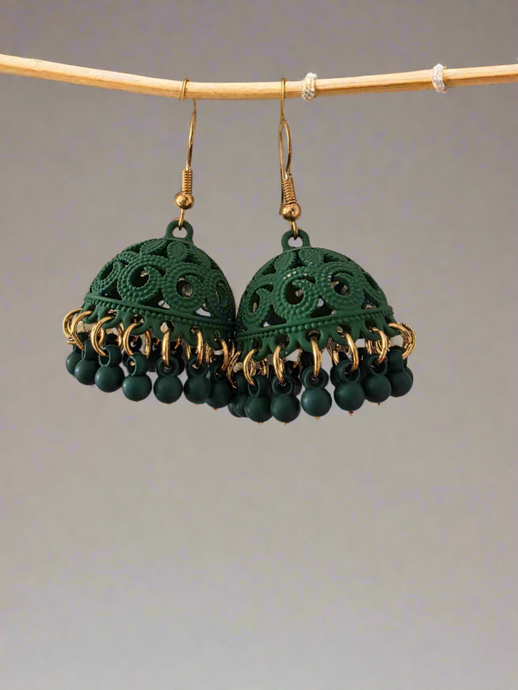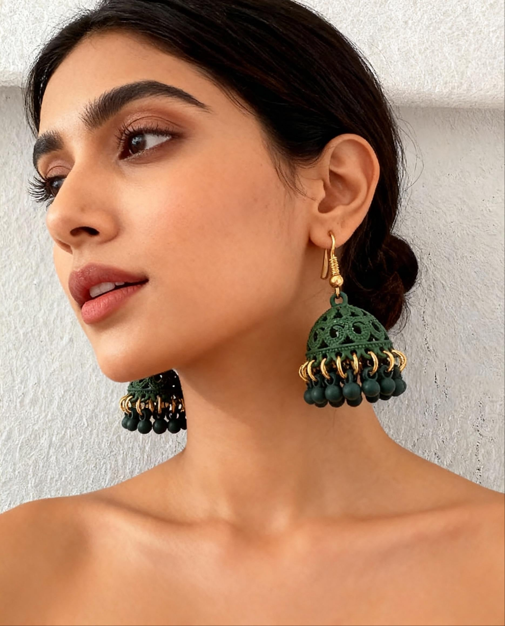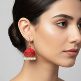 Add a touch of elegance to your look with these traditional handcrafted jhumka earrings, available in four stunning colors – Red, Black, Purple, and Green. Designed with intricate detailing and delicate pearl or bead drops, these earrings are lightweight, comfortable, and perfect for any occasion.