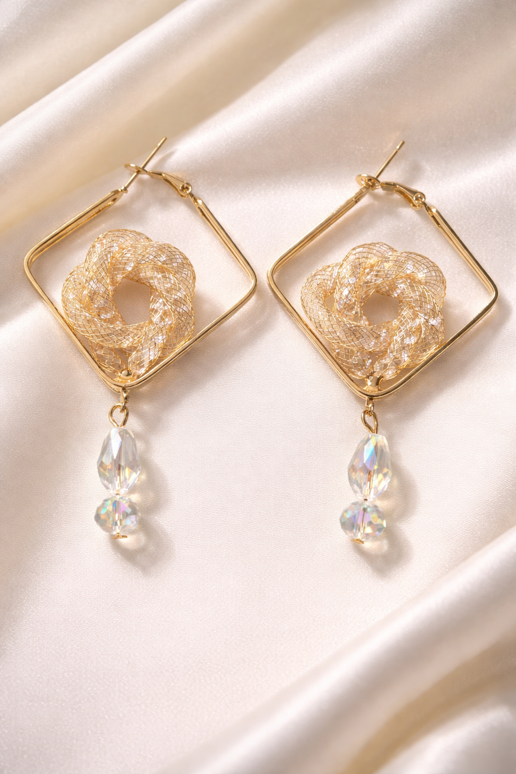 These geometric knot drop earrings blend modern design with subtle sparkle. Crafted in a lightweight structure, each pair features a stylish knot motif framed in a sleek geometric shape, finished with a crystal teardrop charm that catches the light beautifully. Available in both gold and silver finishes, they are perfect for daily wear as well as special occasions.