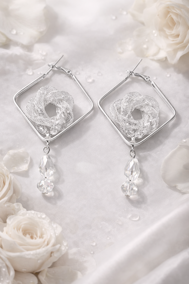 These geometric knot drop earrings blend modern design with subtle sparkle. Crafted in a lightweight structure, each pair features a stylish knot motif framed in a sleek geometric shape, finished with a crystal teardrop charm that catches the light beautifully. Available in both gold and silver finishes, they are perfect for daily wear as well as special occasions.
